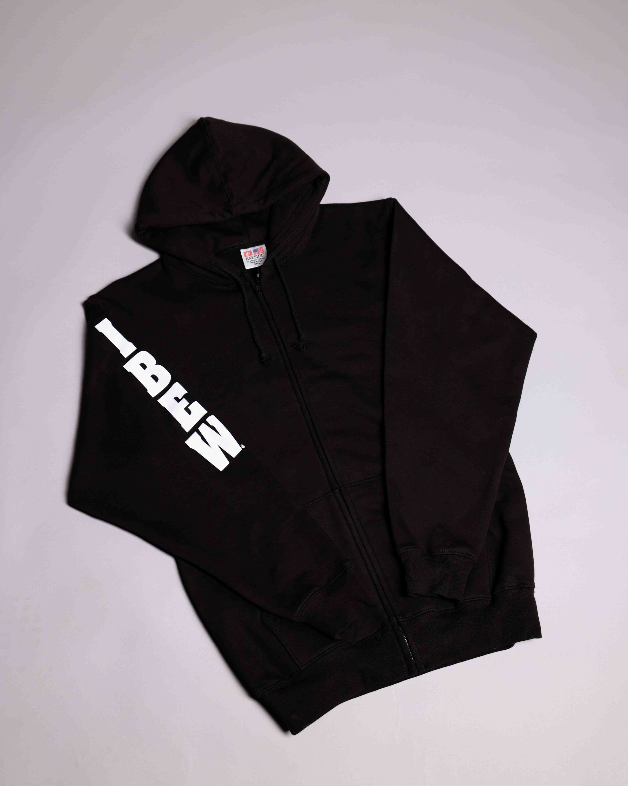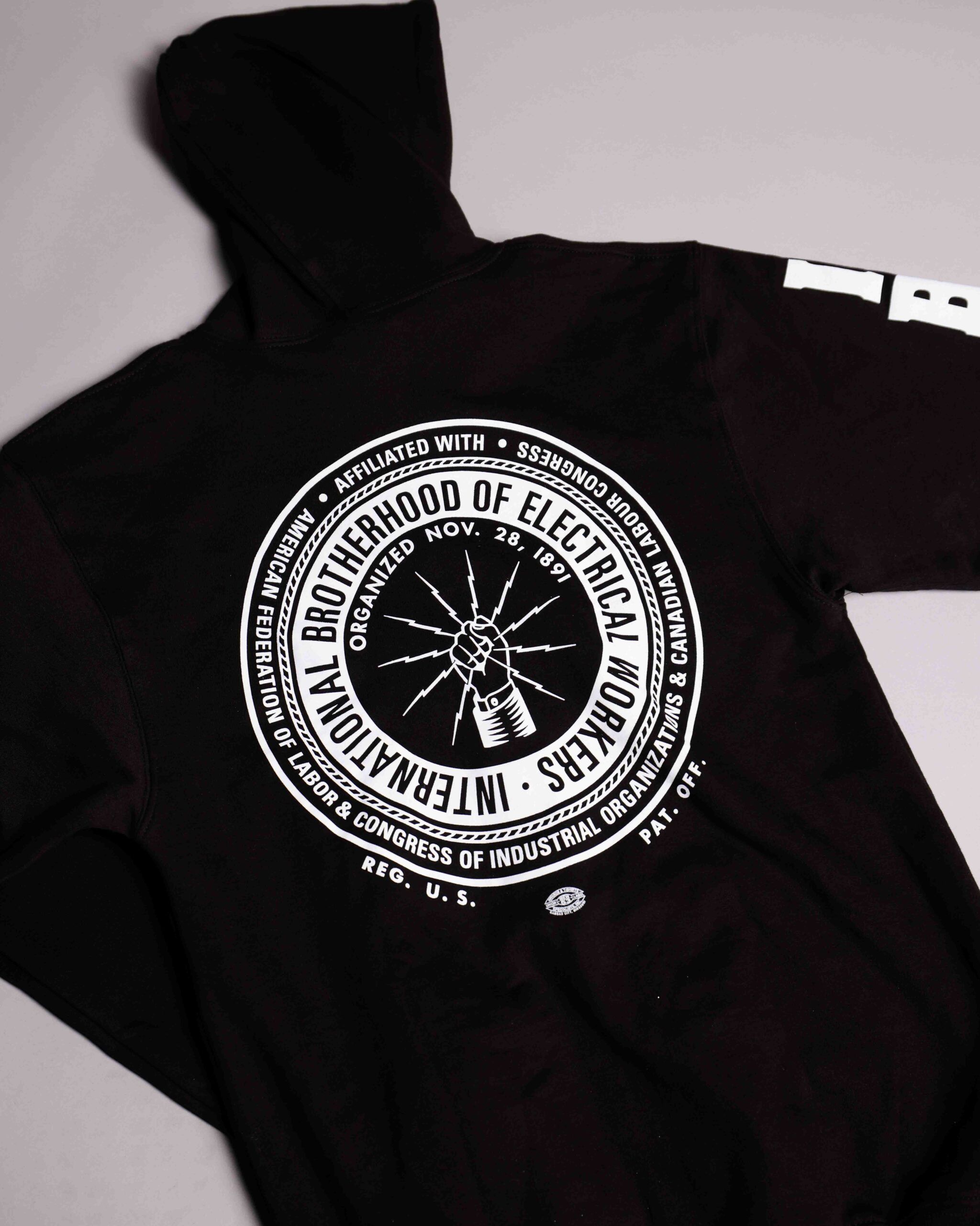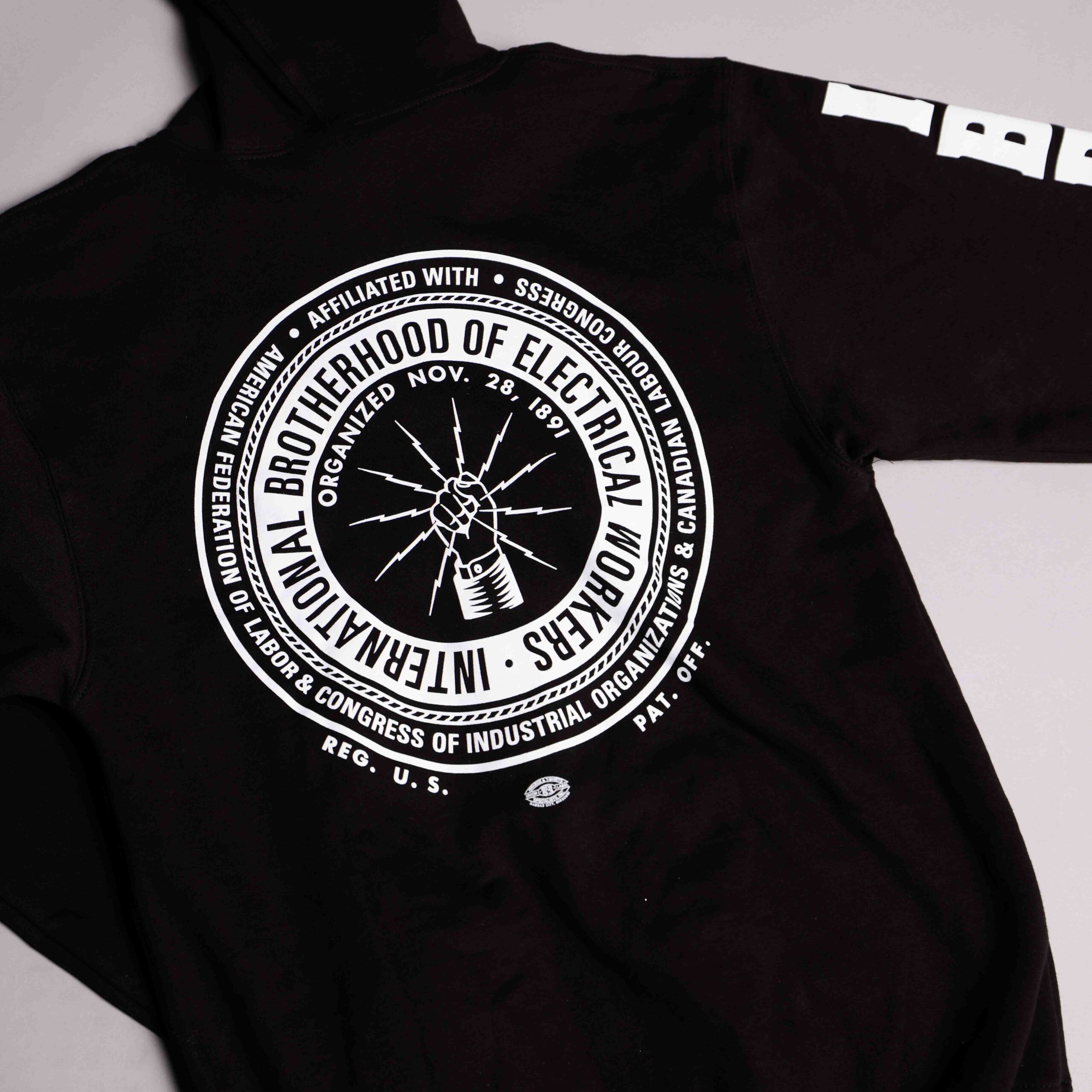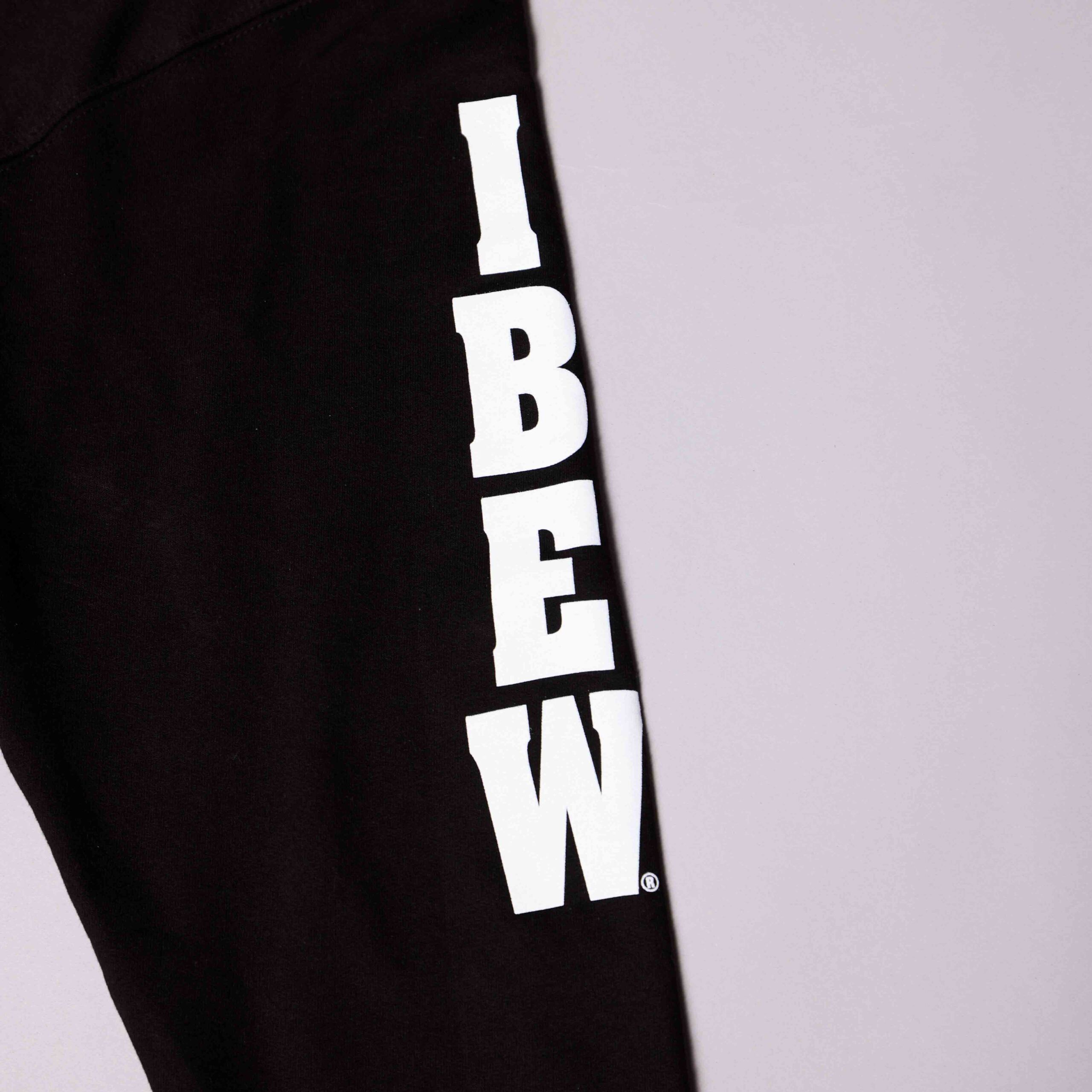 Black 50/50 poly-cotton blend with IBEW initials screened on sleeve and full logo on back in bright white.