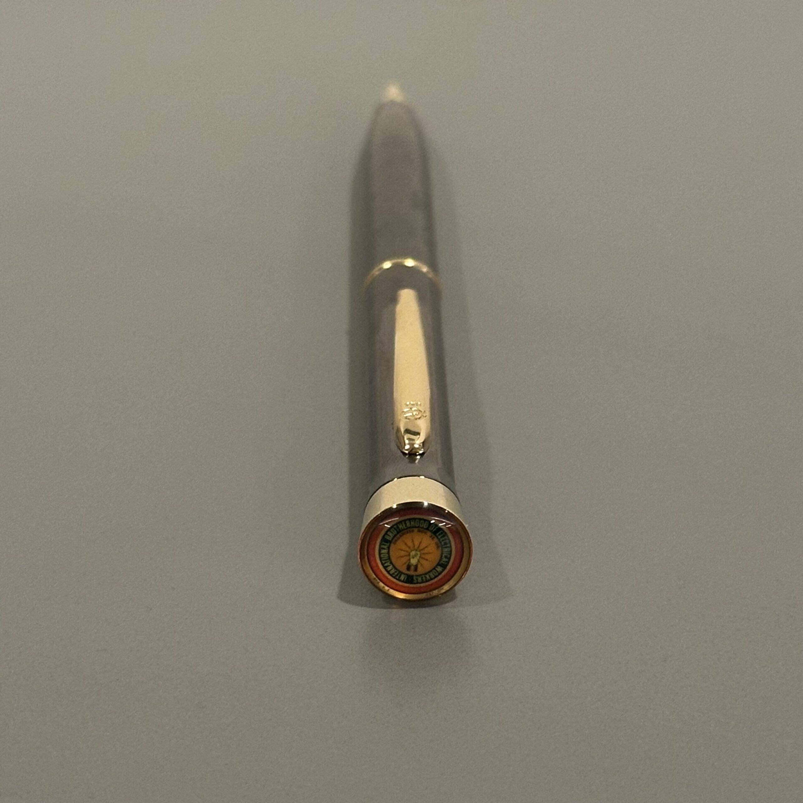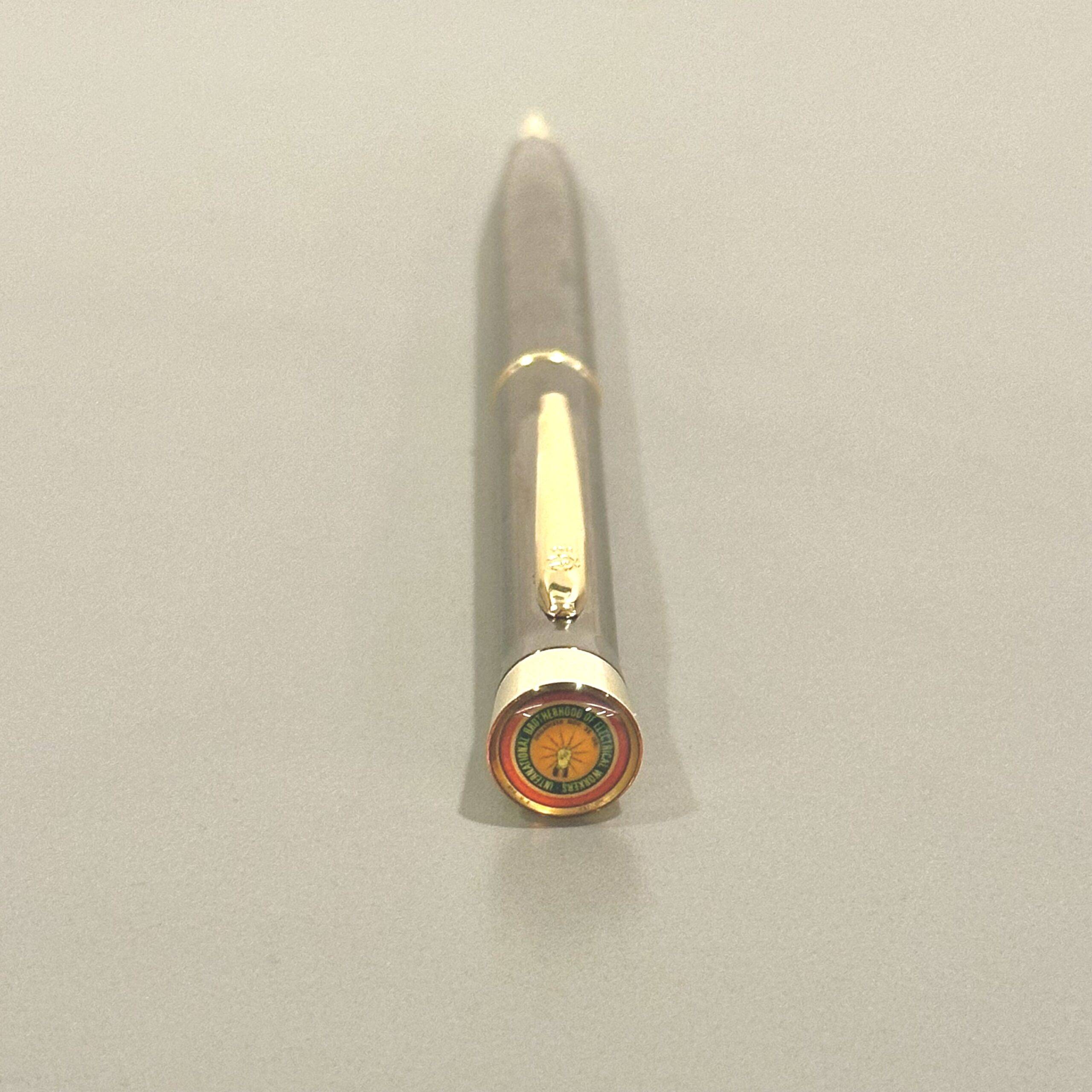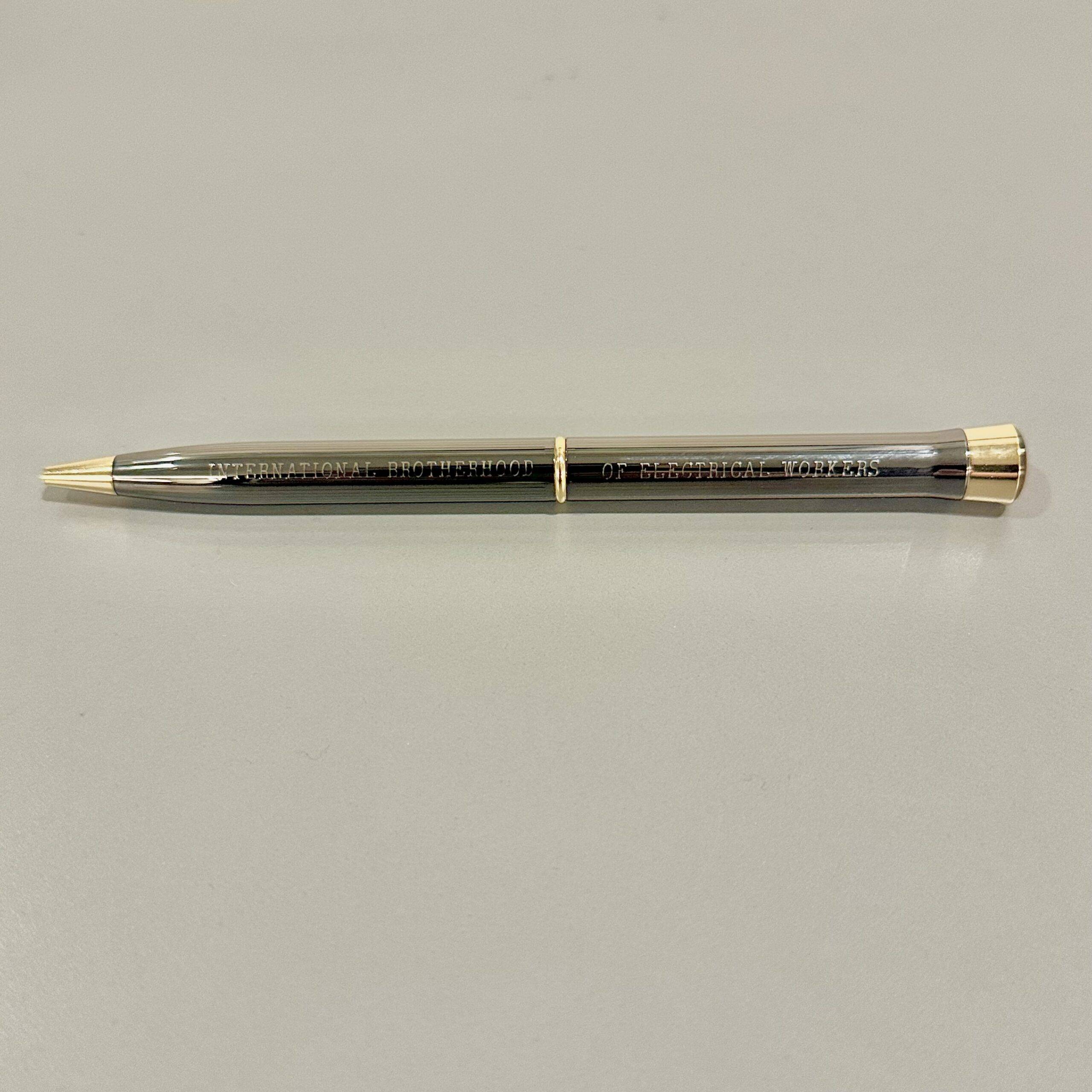 Garland executive ink pen featuring the IBEW logo in a magnified dome top and “International Brotherhood of Electrical Workers” engraved on the barrel. Writes smoothly in black ink.