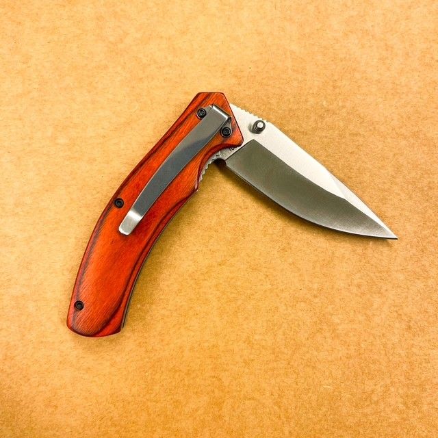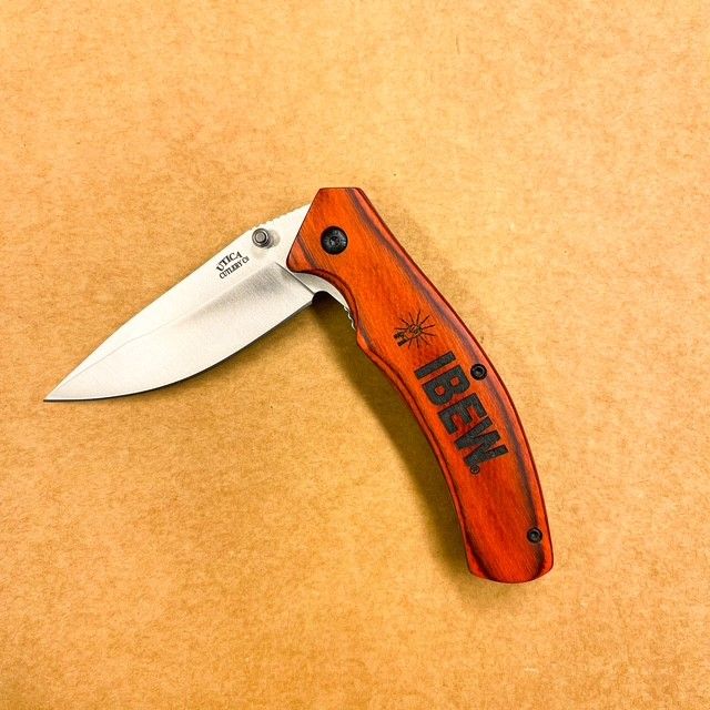 3.13″ satin polished, 1045 stainless steel blade with 4.5″ wooden handle.  Folding liner lock with nylon washers and pocket clip.  Features laser engraved fist and bolts along with IBEW Initials.
