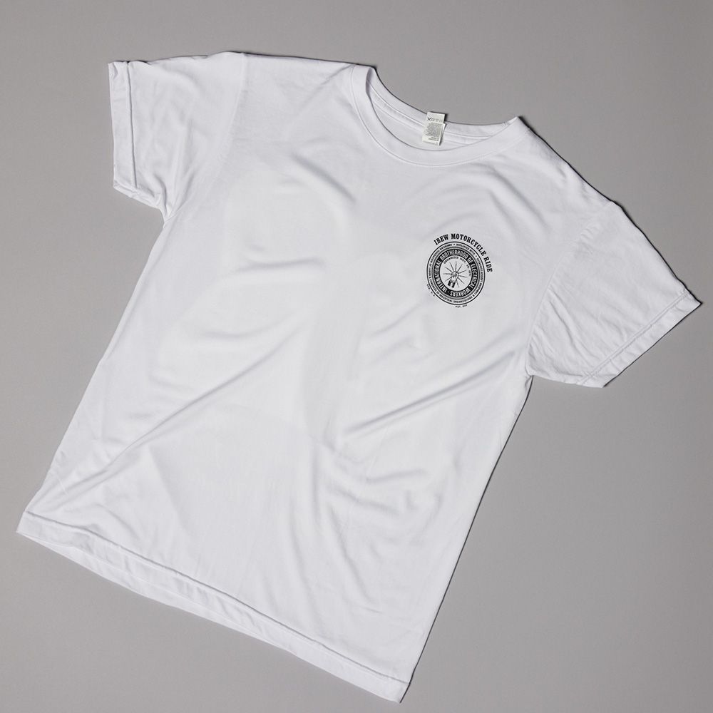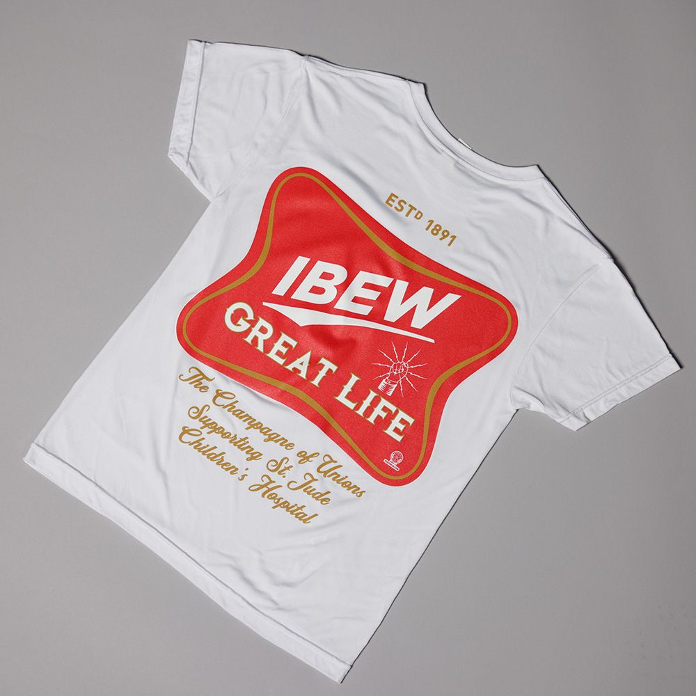 100% Polyester white shirt with custom logo on back and IBEW logo on front. This shirt was used at the 2025 Motorcycle Ride in Champion, PA.
